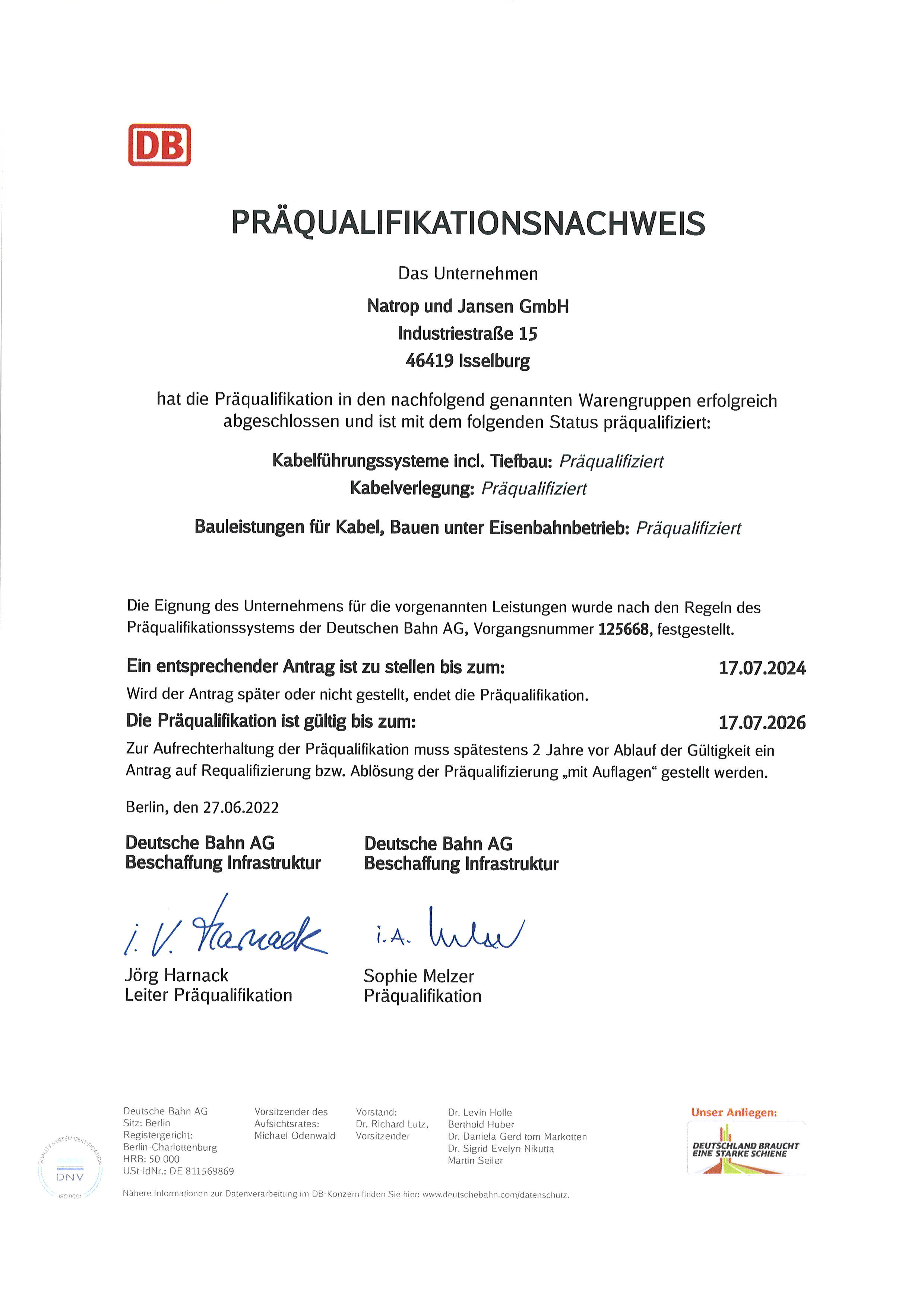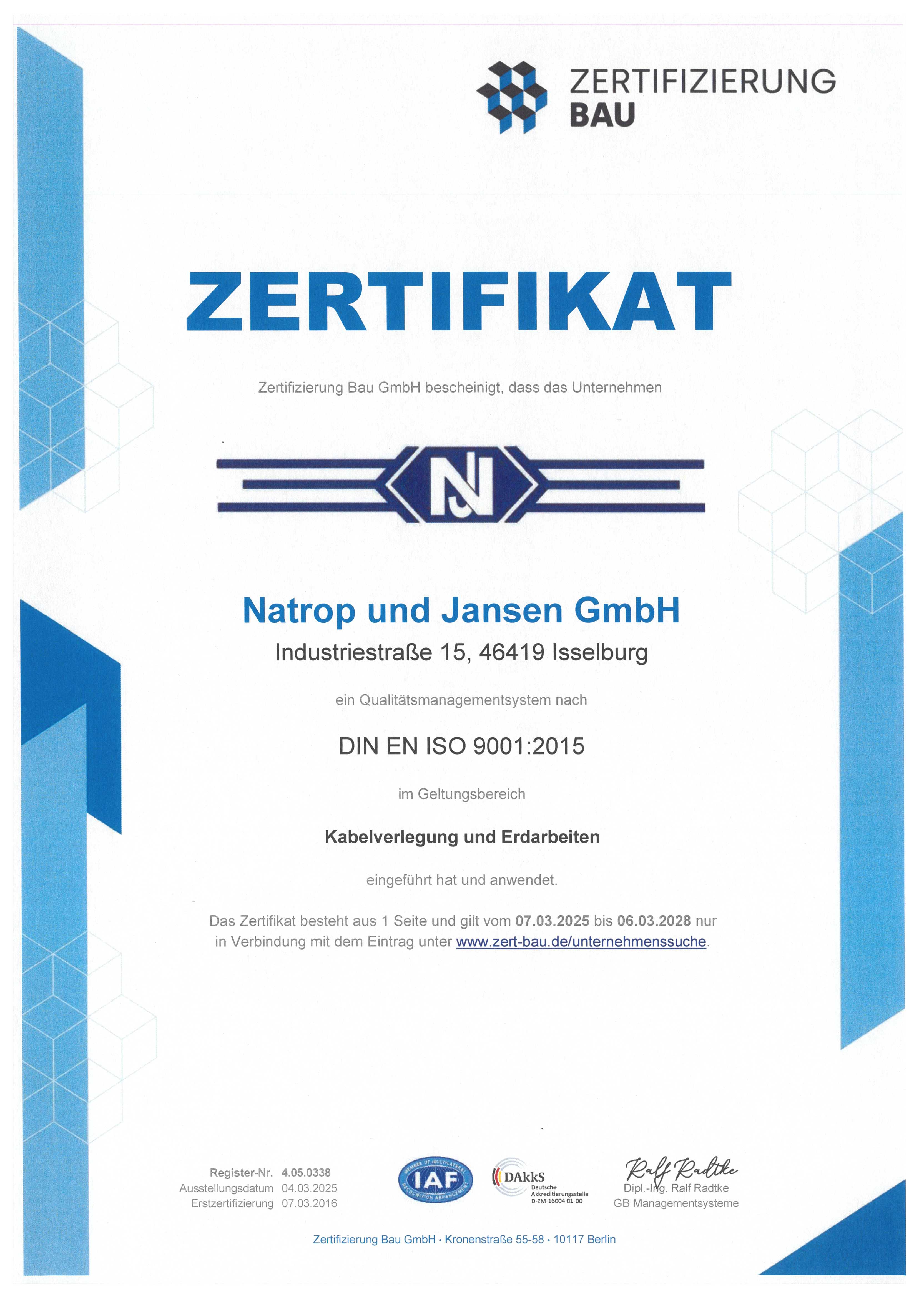ISO Zertifikat (DIN EN ISO 9001:2015 | Geltungsbereich: Kabelverlegung und Erdarbeiten)